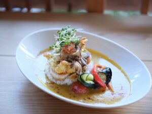 一番人気は「エビと帆立のソテーカレー」。プリプリの海鮮と野菜が豪快に盛り付けられ、辛さ控えめながらスパイス感しっかり。ココナッツミルクや豆乳を使ったクリーミーなルーは、子供から大人まで誰でも食べやすい味わいです。 他にも「欧風カレー」や「スリランカ風キーマ」なども人気。 フルーツサンド、スイーツ、手挽きコーヒー、ドリンクメニューも充実しています。