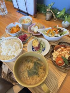 メイン料理&野菜たっぷりの小鉢が並ぶ「日替わりランチ」は20食限定。無農薬や地元野菜、自家製調味料、国内産材料など、身体に優しい素材を使用 。 スイーツプレートやフレンチトースト、日替わりパフェ、特に地元産足守メロンパフェは評判。